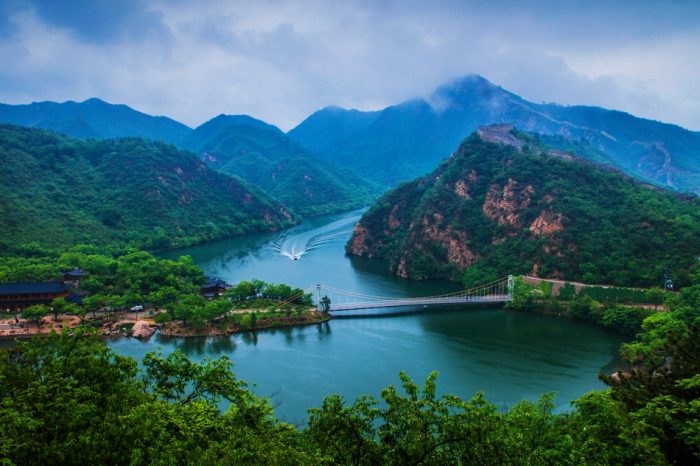 站在跨库桥上,就可以清楚的看到水中长城了。这是景区的第二大看点“巨龙探水湾”也是景区名称的由来。黄花城长城修建时并不在水中,后来在修建西水峪水库的过程中,由于水库大坝截流,导致水位上升,把地势较低的长城淹没在水中。形成长城戏水,水没古城垣的景象,为景区一绝。这一景观在山海关老龙头尚有一段。但像黄花城长城这样三段不同程度出入水中在国内独一无二。景区也因此而得名:水长城旅游区。 一首诗形容水中长城:城抱碧波涟,水没古城垣;城水相呼应,壮美自悠然。